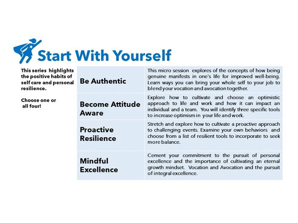 How do you cultivate a proactive approach to creating a healthy and vibrant lifestyle? IT starts by examining one’s own behaviors in response to challenges events. This micro session explores a list of resilient tools to incorporate to seek more balance in your life.